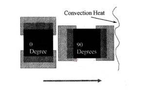 On the test board, the components are placed in two directions, 0 ° and 90 °. Determine whether component orientation (0 ° and 90 °) significantly affects the yield of assembly by analyzing paired samples. The 0 ° direction indicates that both ends of the component pass through the furnace simultaneously, while the 90 ° direction indicates that one end of the component passes through the furnace before the other end, as shown in    Figure 1.Direction of components